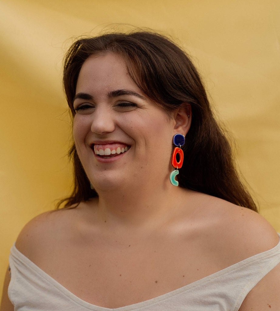 Pendientes de cerámica formados por tres piezas, esmaltadas con brillo y acabados en varios colores.