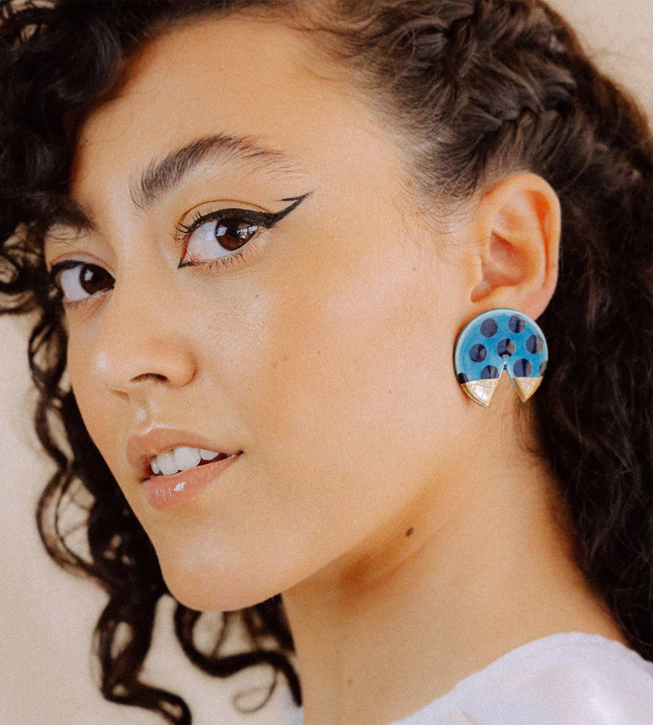 Pendientes redondos decorados con lunares en negro, pieza cerámica cortada a mano y terminada con lustre de oro. Los puedes encontrar en blancos y azules, para que puedas elegir el que más te guste!!