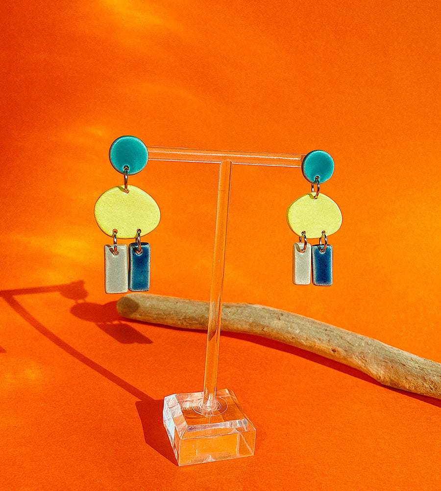 Pendientes de cerámica. Maravillosa creación de cuatro piezas, pero pequeñitos, ligeros como plumas, perfectos tanto como para el día lleno de risas como para la noche llena de baile. Disponibles en tres colores diferentes.