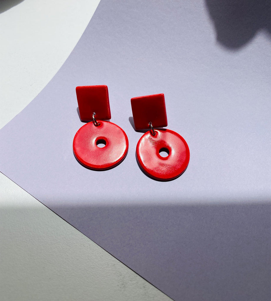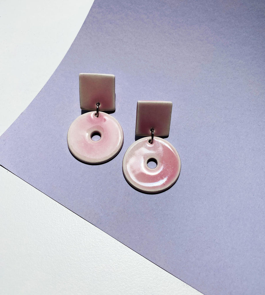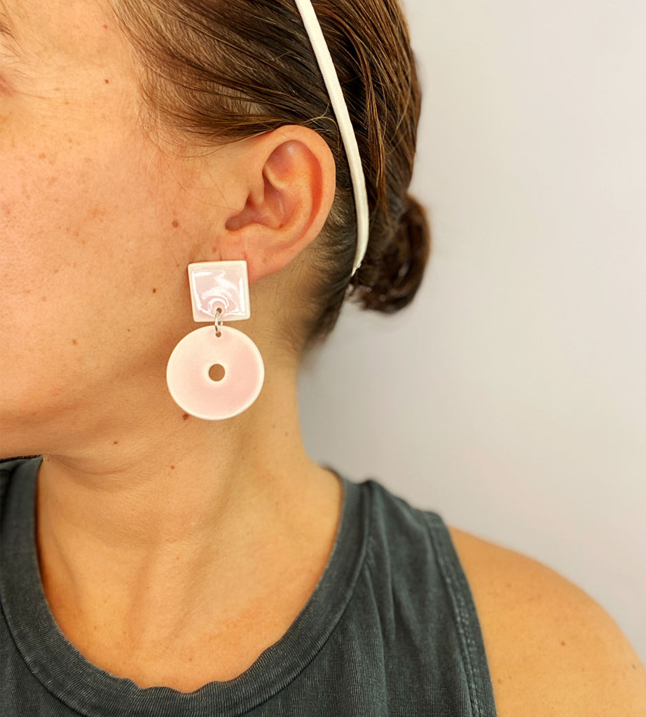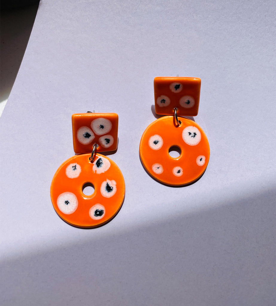 Pendientes de cerámica formados por dos piezas, esmaltadas con brillo y acabados en varios colores.