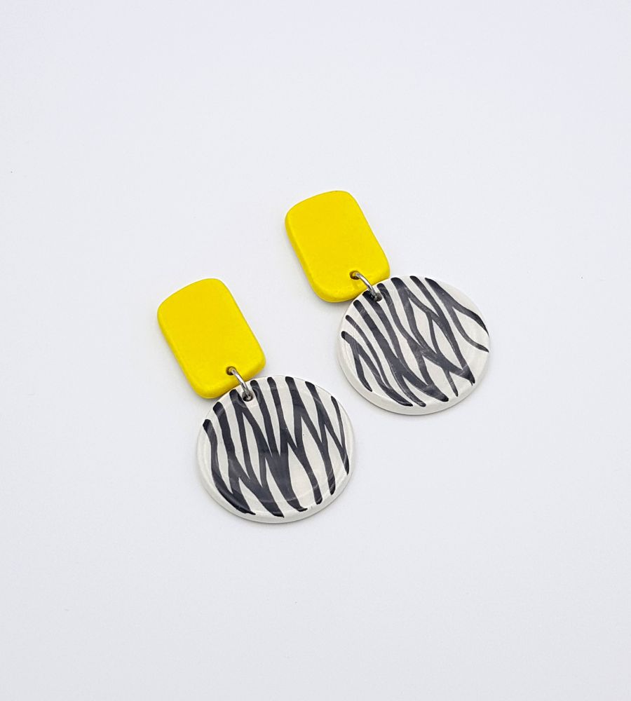 Maravillosos pendientes de cerámica cortados a mano y decorados con un estampado étnico y original. La pieza de arriba la tienes disponible en dos colores, rojo o amarillo, para que puedas elegir el que mejor te combine, ideales puestos!!!