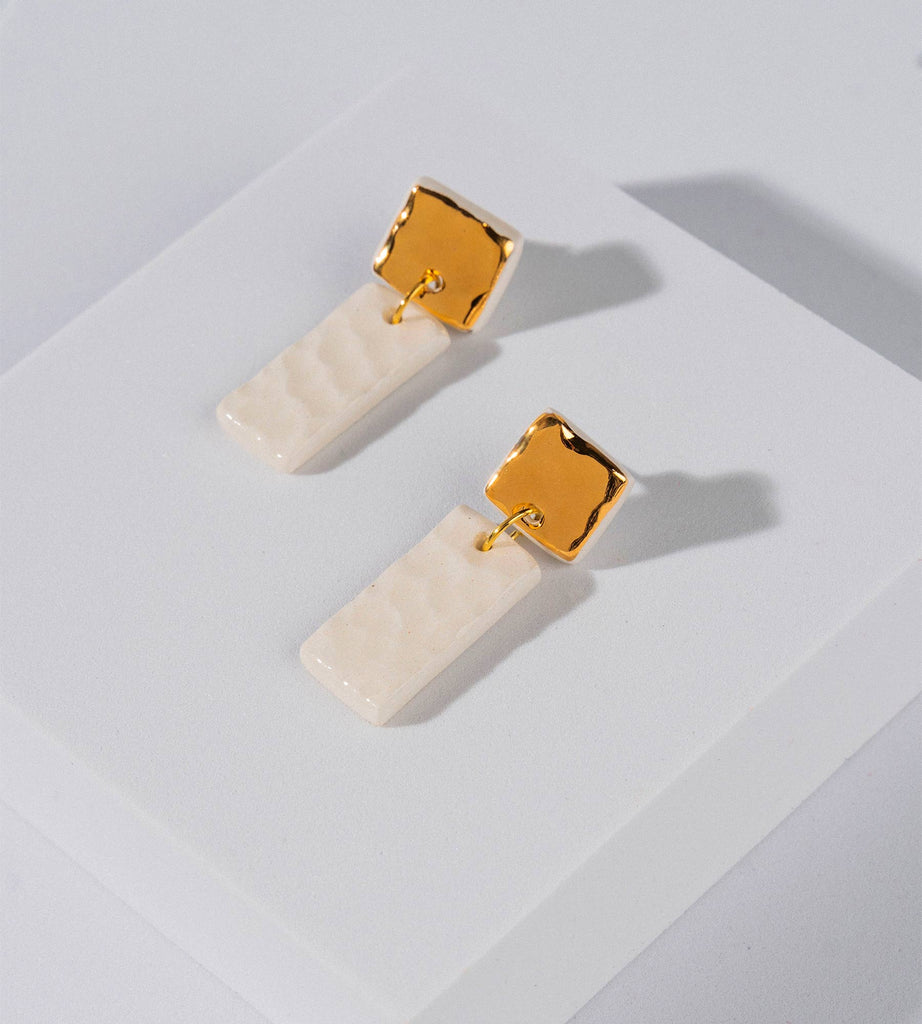 Divinos pendientes de cerámica, dos piezas con textura, con la pieza de arriba terminada con lustre de oro. Disponibles en tres tonos, turquesa, rosa y blanco, para que tengas opción de elegir el que mejor se adapte a tu estilo ;)